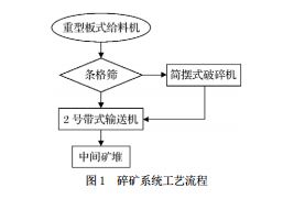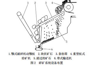 该矿碎矿系统工艺流程如图1所示,设备布置如图2所示,来料首先通过条格筛进行筛选。
