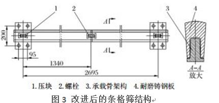 针对条格筛在生产中存在的问题,对格筛条进行了改进设计,改进后的条格筛主要由耐磨构件和承载骨架构件两大部分组成,如图3所示。